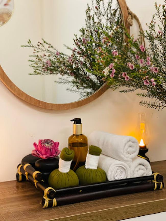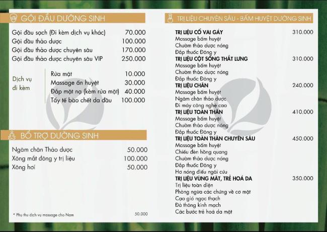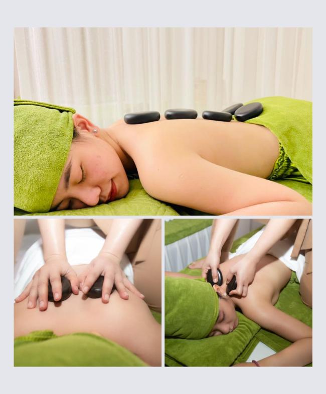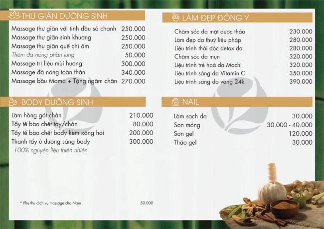 | 코스 | Aroma, swedish, chăm sóc sức khỏe chân tay, chăm sóc mẹ bầu trước và sau sinh, đá nóng, quản lý da mặt, làm móng |